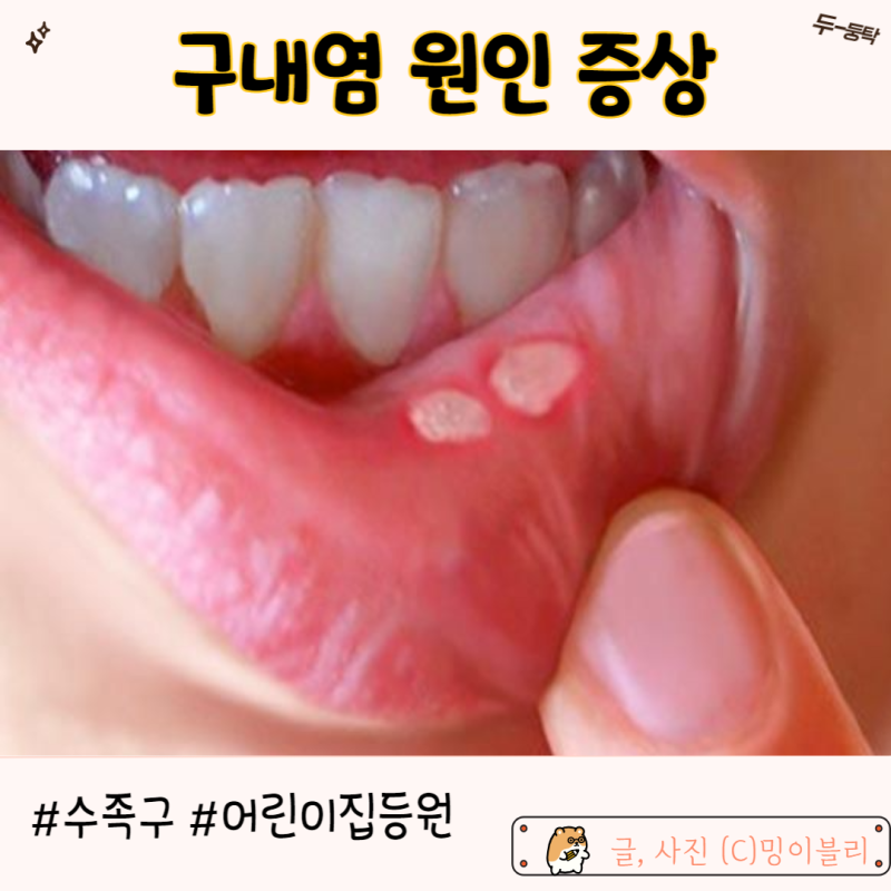 구내염의 원인은 다양하지만 정확한 원인은 알려져 있지 않습니다. 원인으로는 감염, 스트레스, 피로, 구강 위생 불량, 구강 건조, 체중 변화, 영양 결핍, 면역 약화 등이 있습니다.유아 전염성 구내염