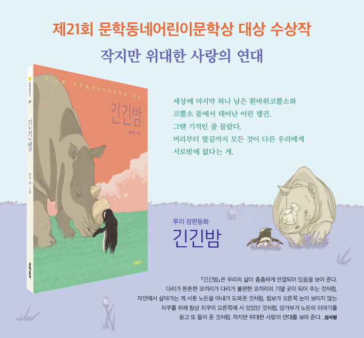 길고 긴 밤, 루리의 장편 동화, 문학동네아동문학상 대상 수상, 초등, 중학년 고학년에게 추천하는 감동의 책. 세계에 마지막 남은 흰바위코뿔소와 그 코뿔소의 품에서 태어난 어린 펭귄. 그때는 그게 기적인지 몰랐어요. 뭐… blog.naver.com