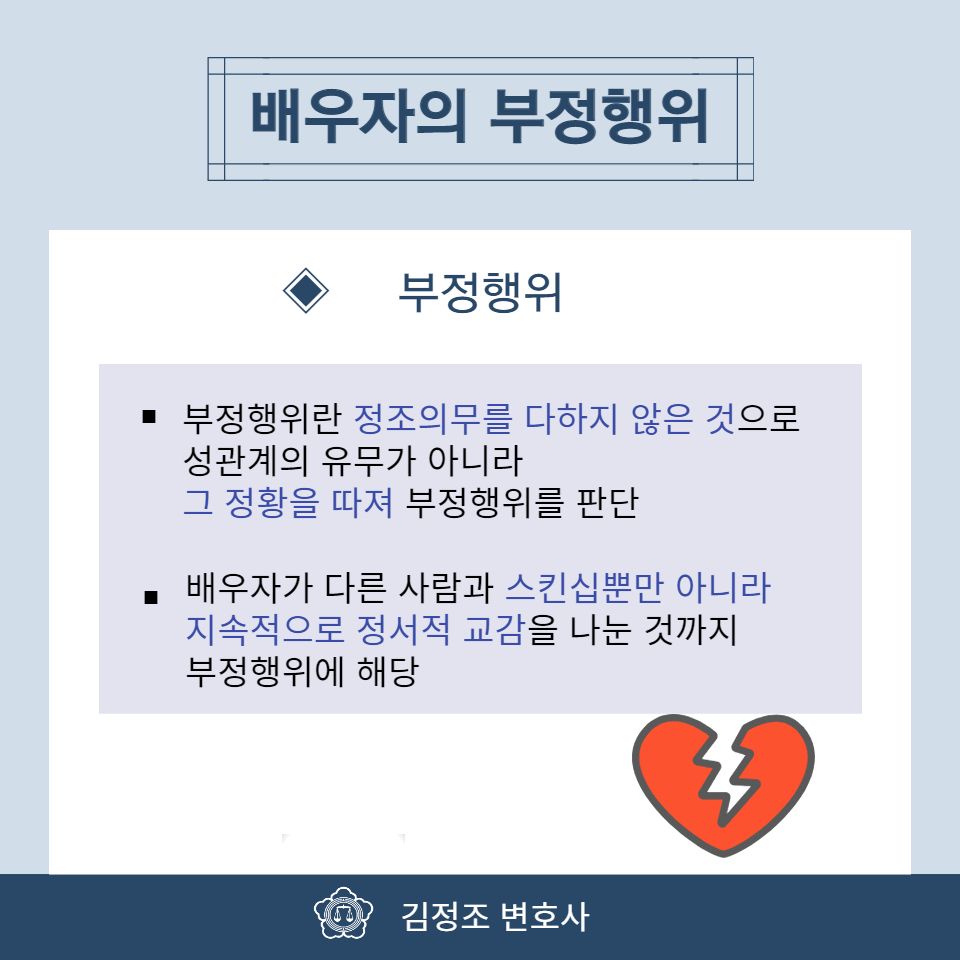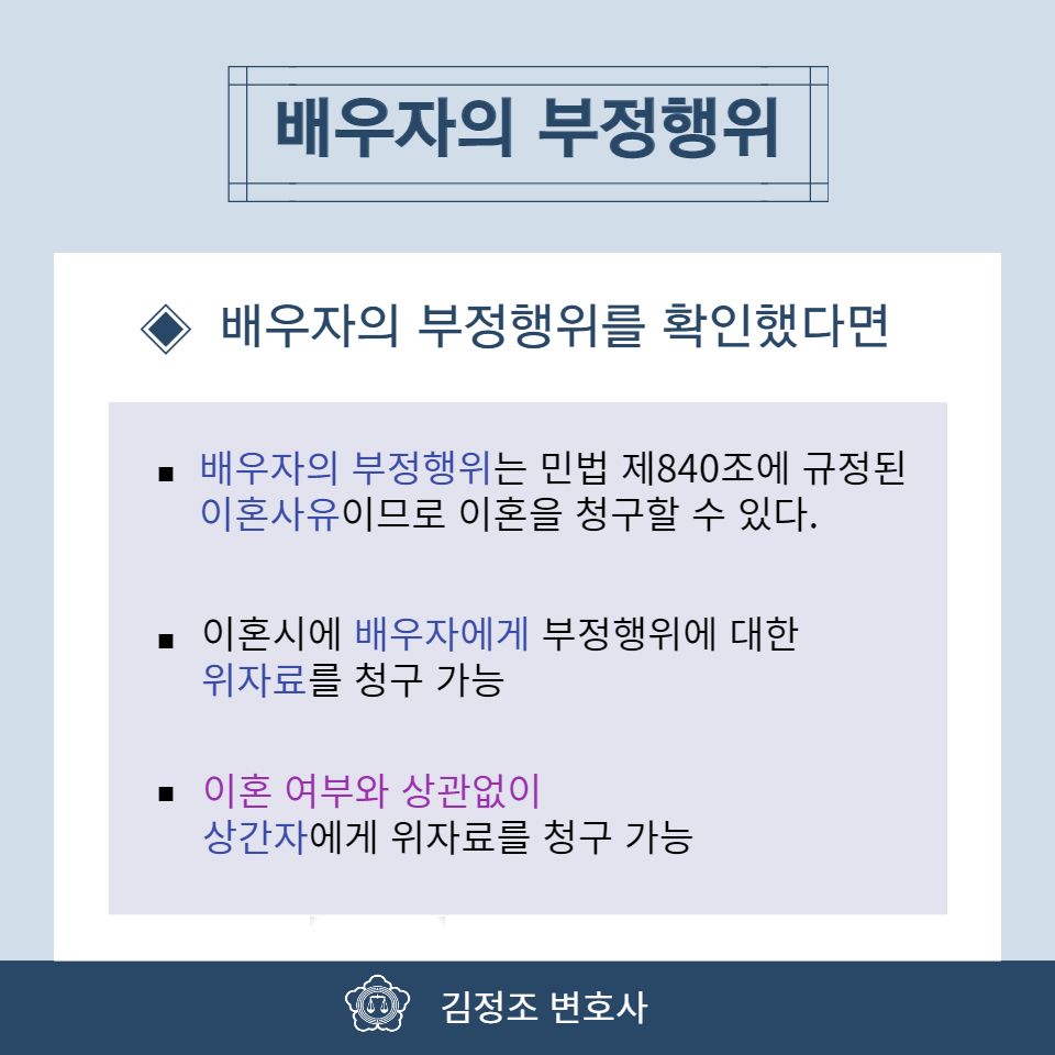 배우자 및 다른 이성과 접촉하는 경우 즉시 쫓겨납니다. 이때 많은 사람들은 단순히 친구나 동료라고 변명할 것입니다. 그래도 단순한 직장 동료 관계라도 성관계가 없더라도 부정 행위로 간주될 수 있습니다. 이혼전문변호사와 상담하면 위자료 청구 가능성에 대해서도 알 수 있다.