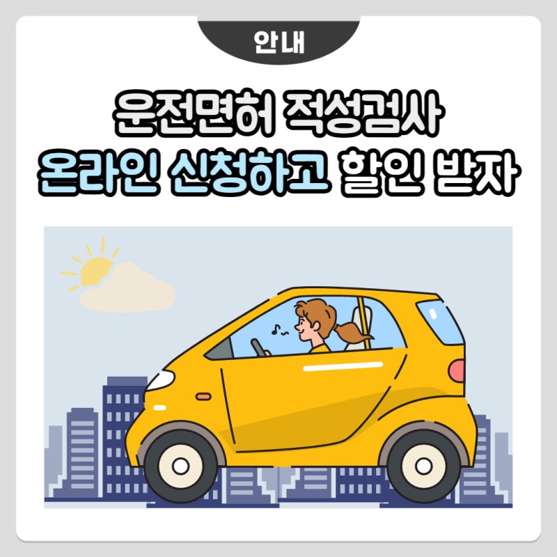 2024년 운전면허 적성검사(갱신) 온라인 신청 및 할인안내 할인기간 : 2024. 1. ~ 2. 지원자 보통면허 적성검사 1종 만 69세 이하 2종 면허갱신 필수서류 여권형(참고) 이미지 파일 6개월 이내 촬영 (jpg) 온라인 결제방법 (카드/계좌이체) 2년 이내 국민건강검진 시력검사 결과 (시력 0.8, 0.5 이상) 일반면허 1종에 한함 신청혜택 : 수수료 10% 할인