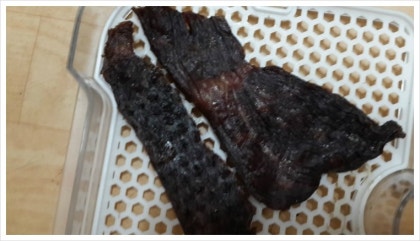 먼저 핵심을 알려드리겠습니다!!! 왼쪽 턱이 이렇게 얇아진게 신기해요!!!! 제가 먹던 육포에 비하면 좀 퍽퍽한 느낌이에요. 여러모로 색다른 느낌과 얇은 느낌이에요!!