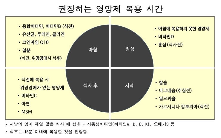 #비타민D 섭취시간 비타민D는 공복에 50% 흡수되지 않으므로 식사 중이나 식후에 섭취하는 것이 좋다. 철분 함량