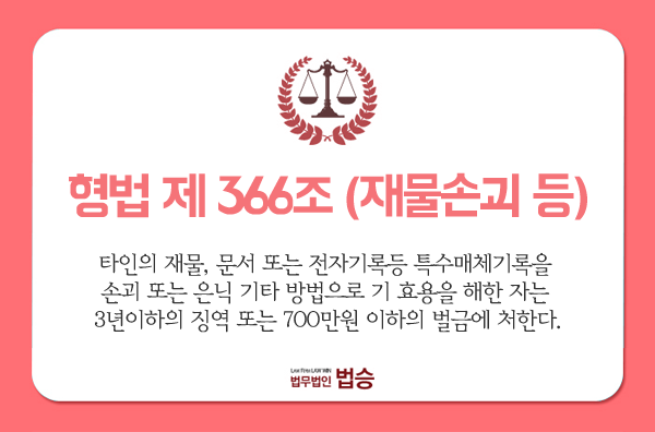 재물손괴란 타인의 재산, 문서, 전자기록, 특수매체기록 등을 훼손하거나 은닉하여 효용에 손해를 끼친 경우에 적용되는 형사사건입니다. 여기서 ‘효익을 해친다’는 것은 대상을 영구적으로 또는 일시적으로 파괴하는 것을 의미합니다. 원래의 목적으로 사용할 수 없을 정도로 손상되거나 은폐된 상태를 말합니다. 재산상의 손해는 형법상 다음과 같이 처벌되며, 재산상의 손해도 처벌됩니다.