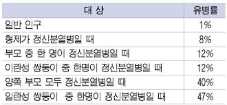 조현병은 망상과 환청, 그리고 의도와 다르게 언어와 행동을 해석하여 이로 인한 사회적 고립, 공격성 등의 기능장애를 의미하는 질환으로 만성적인 형태에 가깝습니다. 조기 진단 시 다양한 치료법으로 예후가 좋으며 그렇지 않으면 개인은 물론 가족, 사회에 큰 고통을 줄 수 있습니다.조현병 유전 양상을 정확히 살펴보면 이 부분에 기인한 것은 사실이지만 무조건 부모나 직계존속 중에 조현병 환자가 있다는 사실만으로 유전적인 형태를 가진 것은 아니고 반대로 가족 중에 이 증상을 가진 사람이 없어도 발생할 수 있지만 쌍생아가 동시에 같은 증상을 보일 확률은 절반에 가깝습니다.뇌 내에서 발생하는 내외부 이상으로 신경전달물질에 해당하는 도파민이 과도하게 분비되는 것은 하나의 조현병의 원인으로 뇌기관 자체의 취약성, 환자가 가진 기저질환, 반복되는 스트레스와 긴장 등 심리적 정서적 요인이 결합해 발생하는 것으로 추정되지만 아직까지 명확한 결론이 내려진 부분은 없습니다.
