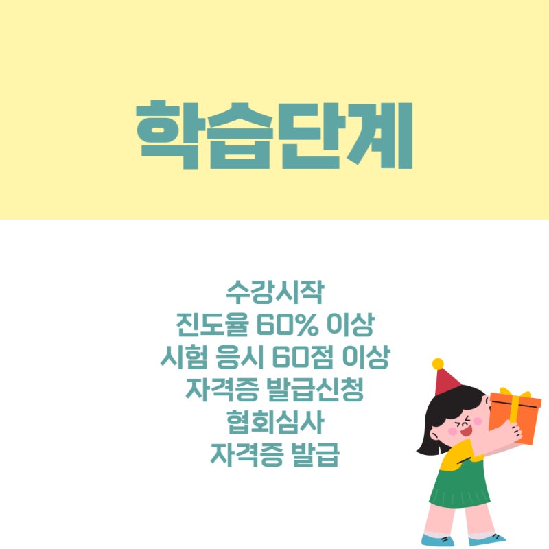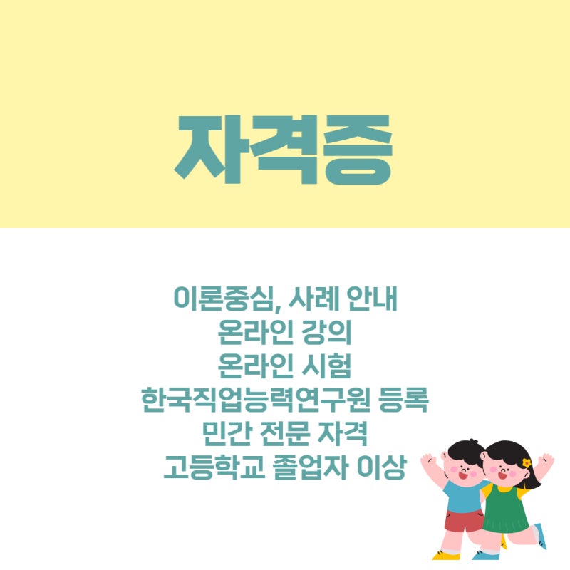 초등학교보육기사 자격증을 다양한 곳에서 준비할 수 있습니다. 회사가 많기 때문에 몇 가지 중요한 사항을 정리하고 그 조건에 맞는 곳에서 공부하기로 결정했습니다. 1) 다양한 커리큘럼을 갖춘 곳 2) 강의비가 부담스럽지 않은 곳 3) 한국직업능력개발원에 정식 등록된 곳 민간자격으로 등록된 곳이므로 한국산업기술연구원에 등록해야 함 직업교육훈련원이 인정받고 이력서에 기재됩니다. 몰랐다면 시험을 두 번 쳤을 겁니다. 커리큘럼 초등보육사 자격증 취득을 위한 커리큘럼을 살펴보았습니다. 총 25개의 강의로 나누어져 있는데, 강의시간은 그리 부담스럽지 않았습니다. 간략하게 커리큘럼을 나열하겠습니다. 1) 돌봄수업의 이해, 2) 교육환경의 변화, 3) 아동발달, 4) 정책방향, 교사의 역할, 운영형태, 5) 생활지도 등 커리큘럼이 여러 부분으로 나누어져 있어 이해하기 쉽다. 공부할 때 이해하세요. 쉬웠 어. 그리고 이론뿐만 아니라 다양한 예도 가르쳐주셨는데, 그게 오랫동안 기억에 남아요. 왜 별도의 실기시험을 볼 필요가 없었는지 이해할 수 있을 정도로 내용이 다양했습니다. 시험일정 시험일정이 따로 정해져 있지 않아 언제 어디서나 시험을 볼 수 있습니다. 장소, 시간, 날짜에 구애받지 않고 시험을 볼 수 있어서 좋았습니다. 특히, 원하는 곳에서 시험을 볼 수 있어서 긴장도 덜하고, 편안한 곳에서 시험을 봐서 기억도 더 잘 나더군요. 대학 입시 때 너무 긴장해서 오답을 쓰는 경우가 있듯이, 너무 긴장하는 것은 시험에 그다지 도움이 되지 않습니다. 그리고 시험 응시 조건은 1) 강의를 100% 출석하고 2) 수업을 60% 이상 이수하는 것입니다. 그렇기 때문에 몇 가지 수업을 들어야합니다. 만약을 대비해 다 들어봤습니다. 테스트 방법 테스트 방법도 편리했습니다. 1) 객관식만 출제2) 필기시험3) 주관식, 서술형 시험 없음4) 실기시험 없음. 필기시험만 치렀기 때문에 준비부터 합격까지 거의 4주만에 시험을 마쳤습니다. 마음만 먹으면 면허 취득까지는 그리 오랜 시간이 걸리지 않습니다. 난이도(합격률) 시험의 난이도는 그다지 높지 않아 합격률이 97% 이상으로 매우 높았습니다. 하지만 열심히 준비하지 않으면 나쁜 결과가 나오겠죠? 그래서 계획을 세우고 열심히 공부했어요. 공부방법 : 처음에는 공부하려고 할 때 펜을 잡은 지 오래돼서 집중이 안 되고 계속 휴대폰만 쳐다보고 있었습니다. 그래서 이대로는 진전이 안 되서 계획을 세웠어요. 이번 시험을 준비하시는 분들에게 저의 공부방법이 도움이 되길 바라며 적어보겠습니다. 1) 기출문제 풀기 2) 오답 메모하기 3) 온라인 강의 매일 듣기 이렇게 복습 중심으로 공부하다 보니 기억에 오래 남고 좋은 루틴이 되었습니다. 특히, 오답노트를 만든 이유는 같은 문제를 다시 틀리지 않기 위함이기도 하지만, 다양한 문제와 예시를 반복해서 볼 수 있어서 도움이 되기도 했습니다. 공부를 하면서 아이들에게 도움이 되는 인성, 생활지도, 안전지도, 응급처치 등의 내용을 배울 수 있어서 실생활에 도움이 될 것 같다는 생각이 들었습니다. 그리고 아이들만 있는 공간에서는 문제가 발생할 수 없기 때문에 이런 내용을 배울 수 있다면 많은 도움이 될 것이라고 생각했습니다. 그리고 강의 영상 퀄리티도 좋아서 수업시간에 눈이 덜 피곤했어요. 모니터를 오랫동안 보면 눈이 아플 때도 있지만, 피로감이 훨씬 덜해서 공부 효율이 더 좋아졌습니다. 그리고 꼭 노트북만 가지고 수업을 듣는 것은 아니고, 지하철이나 이동 중에도 휴대폰으로 수업을 들었습니다. 기출문제를 여러번 풀어보니 정말 많은 도움이 되었습니다. 다양한 문제를 풀다보니 시험에서도 비슷한 유형의 문제가 나오더라고요. 시험을 볼 때마다 오답 수가 줄어드는 것을 볼 수 있어서 확실히 의욕이 생겼습니다. 처음에는 오답이 늘어나서 당황스러웠지만, 점점 발전하는 모습을 보니 뿌듯했습니다. 열심히 일한 결과 집에서 면허증을 받았습니다. 인증서 유형과 카드 유형의 두 가지 유형이 발급됩니다. 인증서 종류가 라이센스처럼 보이기 때문에 더 멋있어 보입니다. 저는 자격증을 취득하자마자 바로 일자리를 찾았습니다. 제가 자격증을 취득한 후에 그들은 저에게 더 많은 연락을 주었습니다. 전문적인 인력이 필요할 것 같은데요? 나는 빨리 일자리를 얻었고 돌봄 교실에서 다양한 업무를 담당하고 있습니다. 확실히 취업 전망이 좋은 직업이기 때문에 조금만 공부하면 원하는 곳에서 일을 시작할 수 있습니다. 맞벌이 증가와 저출산으로 인해 다양한 육아정책이 개발되고 있다고 합니다. 그렇기 때문에 앞으로는 더 좋은 환경에서 다른 곳에서 일할 수도 있을 것 같아요. 처음 걱정했던 것과 달리 공부기간과 초등학교 보육전문사 자격증 취득은 그리 어렵지 않았습니다. 게다가 꽤 높은 점수로 합격할 수 있었습니다. 도전하시는 분들 모두 좋은 결과 있으실 거라 생각합니다. 강한 의지와 열정만 있다면 누구나 할 수 있으니 꼭 도전해보시길 바랍니다. 한국자격 자격평가원 – 공식적으로 자격증을 발급하는 교육기관입니다. 100만 회원이 선택한 믿을 수 있는 교육기관 대한민국 교육브랜