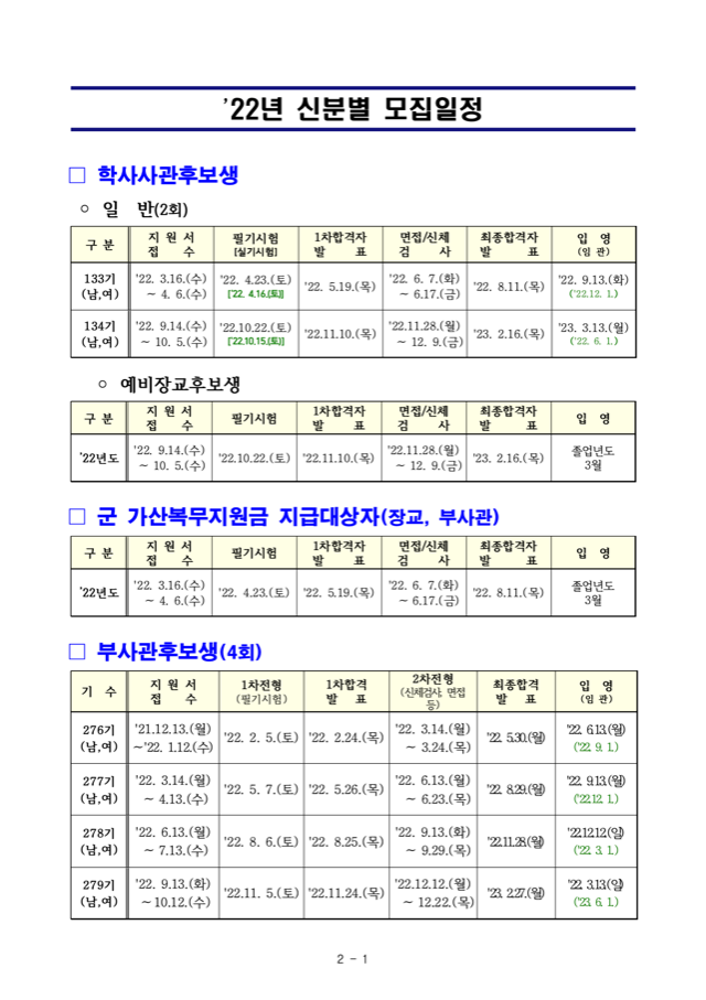 AI 영상면접의 경우 2023년 8월 25일(금)부터 2023년 8월 31일(목)까지 성적반영을 확인하셔야 합니다. 2차 전형 면접 및 신체검사는 2023년 9월 11일(월)부터 9월 9일까지 진행됩니다. 2023. 매월 22일(금)에 진행됩니다. 마지막으로 최종 합격자 발표는 2023년 11월 28일 14시 해군 홈페이지를 통해 확인할 수 있으며, 합격자는 2023년 12월 11일 월요일 13시에 입대하게 된다. 2024년 3월 1일 금요일.