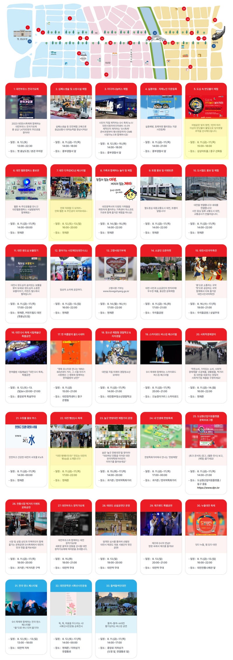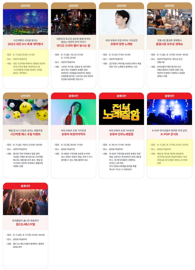 안녕하세요. 태리네 아빠 구우욱입니다. 이번 주 금요일인 8월 11일부터 17일까지 0시부터 7일간 대전 구도심에서 축제가 열립니다. 축제기간이 작년보다 길어지고, 음량도 너무 커져서 걱정이네요. 😀 그럼 오늘은 지금까지 공개된 정보를 바탕으로 00:00 페스티벌에 대한 기본 및 핵심 정보에 대해 알아보도록 하겠습니다. 01. 행사개요 “잠들지 않는 대전, 끝나지 않는 즐거움!” (캐치상) 광고 후 계속됩니다. 다음 주제 작성자 취소 2023년 대전 심야축제 기본정보 및 K-POP 콘서트 라인업 재생 4,283 좋아요 1 좋아요 공유 0:00:00 재생 음소거 00:00 00:35 실시간 설정 전체 화면 해상도 자동 480p 자막 비활성화 재생 속도 1.0배 (기본값) 해상도 자동(480p) 1080p HD 720p HD 480p 270p 144p 자막 설정 비활성화 옵션 글꼴 크기 배경색 재생 속도 0.5x 1.0x(기본값) 1.5x 2.0x 알 수 없는 오류가 발생했습니다. 도움말이 음소거되었습니다. 도움말 라이센스 이 영상은 고화질로 재생할 수 있습니다. 설정에서 해상도를 변경해보세요. 자세히보기 0:00:00 2023 대전 00:00 축제 기본정보 및 K-POP 콘서트 라인업 대전 브루스를 모티브로 한 대전 원도심 경제 활성화 축제, 여름을 보낼 수 있는 거리 문화예술 축제 다른 방법으로. 대전의 과거, 현재와 미래로 가는 시간여행 축제 02. 기본정보 행사장 배치 및 교통통제구간 행사기간 8월 11일(금) ~ 8월 17일(목) 7일간 행사장소 대전역에서 중앙로 경유하여 대전까지 옛 충청남도청(근현대사) 전시장으로 이어지는 차 없는 거리축제 프로그램, 무대행사, 부대행사, 프린지페스티벌 등 (자세한 내용은 아래 요약) 전반적인 행사정보를 살펴보면, 거기에 반복되는 프로그램도 많고 페스티벌이 무슨 말을 하려는 건지 모르겠네요… 7일 동안 진행되는 이벤트 중 개인적으로 좋다고 생각하는 이벤트를 구성하는 것도 좋을 것 같아요 . (아래 참고) 03. 교통통제 이번 축제는 대전역에서 구충청남도청(근현대사전전시관)까지 차량이 없는 거리이다. 진행됩니다. 이에 따라 교통 통제가 불가피해지며, 차량 통제 기간은 8월 9일 수요일 5시부터 18일 금요일 5시까지 입니다. 앞뒤로 -2일, +1일이 추가됩니다. 대전역 앞 도로 근현대사전시관 앞 도로는 통행이 가능하지만 일대 교통이 마비돼 여파가 중구를 넘어 구도심 전체에 영향을 미칠 것으로 예상된다. 시내버스는 우회로를 운행하고, 시내철도는 밤 12시까지 연장된다. 서비스를 확대할 계획이므로 가능하면 지하철을 이용하는 것이 좋을 것 같습니다. 셔틀버스 운영주차장 04. 프로그램의 주요 관심사는 공연장의 규모가 매우 크다는 점이다. 식전공연 및 오프닝 행사는 9시까지 대전역무대에서 진행되며, 야간 관광선포식 및 K-POP 콘서트는 9시부터 중앙로 특설무대에서 진행된다. K-POP 콘서트는 금요일부터 목요일까지 매일 2시간 동안 진행됩니다. 작년에 현아 화재로 불꽃놀이가 취소되어서 개막식은 못 갔는데 집에서 소리가 들렸던 기억이 나네요… 내일 전화해서 불꽃놀이에 대해 알아보고 추가하겠습니다. + 불꽃놀이 문의 결과 (8월 8일 4시 50분) + 자정에는 불꽃놀이가 예정되어 있지 않다고 하네요! 05. 주요 행사 및 KPOP 콘서트 라인업 이전 이미지다음 이미지 보기를 클릭하세요~ 개인적으로 생각하는 주요 이벤트를 정리해봤습니다. 8월 11일 20:00~21:302023 대전 00:00 페스티벌 개막식(김의영) 대전역 특설무대 8월 11일~17일 21:00~23:00 K-POP 콘서트 / 중앙로 특설무대(코요테) 콘서트 17일 목요일 20:00~21:00) K-POP 콘서트 라인업 11일(금) – 김범수 12일(토) – 에이핑크, 김종국, Aiki&HOOK, 프로미스나인) 13일(일) – 울랄라 세션 14일(월) – 에일리 15일(화) – 포레스텔라 16일(수) – 장윤정 17일(목) – 코요태 8월 11일~17일 14:00~0:00 충남도청 앞 사거리 빅잼 꿈돌이슈퍼 대형전시 8월 11일~17일 17:00~0:00목척대교 부근 건맥페스타 8월 11일~17일 17:00~0:00 대흥동 맥주거리(NASA 볼링장 부근) 8월 11일~17일 15:00~18:00 도심 속 반딧불빛 체험 상상아트홀 12일~13일 16:00~20:00 DICU 페스티벌 현존 11일~17일 17:00-22:00 빵(0)시 페스티벌 현존 작년에는 0시 뮤직 페스티벌이라는 이름으로 4일간 열렸는데, 작년에는 라인업이 좀 더 풍성해졌죠. 그런데 이번에는 콘서트 형식으로 2시간 정도 볼 수 있을 것 같아요. 다행히 수요일까지는 비 소식이 없고, 태풍이 지나고 더위가 조금 누그러진 것 같아서 대전야밤축제 기간에는 날씨가 좋은 것이 다행인 것 같습니다. :DI가 전체 일정에 참석할 수는 없지만, 하루 이틀 정도 여유를 갖고 개막식과 콘서트를 관람하겠습니다. 나는 가야 할 것 같아요. 전체적으로 기간은 길지만, 행사 규모는 기간에 비해 실망스럽습니다. 기존 대전에서 열리는 축제들과 큰 차이는 없고, 다소 사소하다는 느낌이 듭니다. 하지만 대전심야축제는 대전광역시의 축제로 간주되지 않는다. 전통을 이어가는 만큼 올해도 문제없이 성공적으로 개최되길 바라며, 내년에도 많은 발전을 이루어 더욱 풍성한 축제가 되었으면 좋겠습니다 #대전 #대전축제 #대전00시축제 #기본정보 #라인업