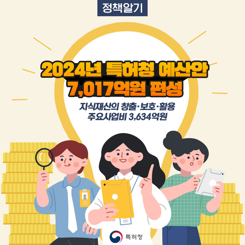 특허청(청장 이인실)은 2024년 예산을 2023년* 대비 5.1%(373억원) 감소한 7,017억원* 편입했다고 밝혔다. 특허청 예산 : (’23) 7,390억원 → (’24년예산) 7,017억 원(Δ373억) 일반회계이입 감소*(Δ359억)로 인해 올해 대비 내년도 예산계획 전체 규모 축소되었으나, 주요사업 지식재산의 창출, 보호, 활용에 투자된 비용은 3,634원으로, 올해 대비 16억원** 증가하였습니다. 1억원으로 확대* 일반계좌이체 : (’23) 1,525억원 → (’24예산안) 1,166억원 (Δ359억원)** 주요사업비 : (’23) 3,618억원 → (’24년) 24예산안) 3,634억원 1억원(+16억원) ❶ 지식재산권 지원을 통한 우리 기업의 수출역량 강화