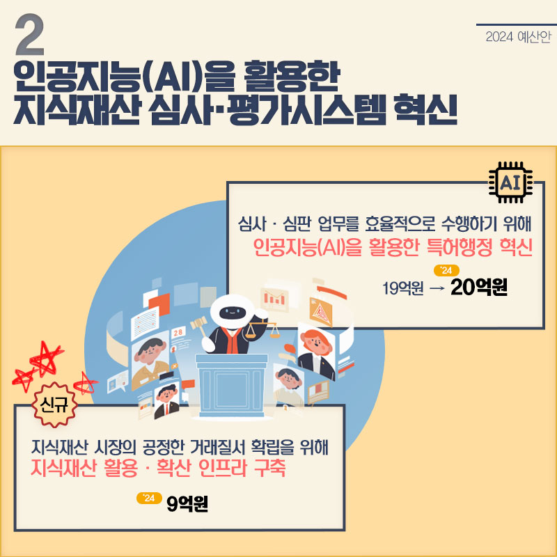 강력한 지식재산권으로 무장한 중소기업의 수출드라이브를 지원하기 위해 해외지식재산권 분쟁 대응을 밀착 지원하는 해외지식재산센터*(IP-DESK)를 확대 개편합니다. , 각 지역의 수출 전망이 있는 중소기업을 대상으로 종합적인 지적재산권을 제공합니다. 지원확대**.* 해외지식재산센터 : (’23) 33억원, 11개국 지원 → (’24예산) 54억원, 40개국 지원 (+21억원, +29개국)** IP – 기반 해외진출 지원 : (’23) 117억원, 673개사 → (’24예산) 140억원, 808개사 (+23억원, +135개사) ❷ 인공지능(AI)을 활용한 지식재산권심사·평가 시스템 혁신